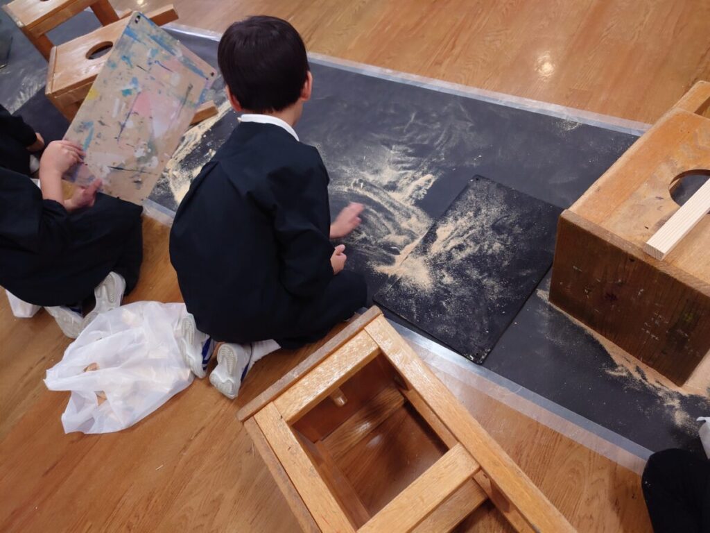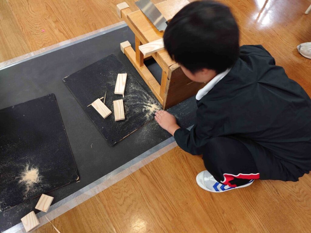 「木も切れたけど、粉もきれい。切った木によって色も違うんだね。次は⚪︎⚪︎な形に木を切ってみよう。」と、黒いシートの上で活動したことで、自然と木の特徴が際立ち、木に対して様々な感性を喚起していたと感じました。そして、斜めに切ったり、切り跡をつけたり、中には「先生、こんな匂いの木が切れたよ。」と匂いに関心をもったりする姿が見られました。また、黒い木の板を置いたことで、自然と板の上に木や木の粉を並べたり、組み合わせたりする姿が生まれていました。