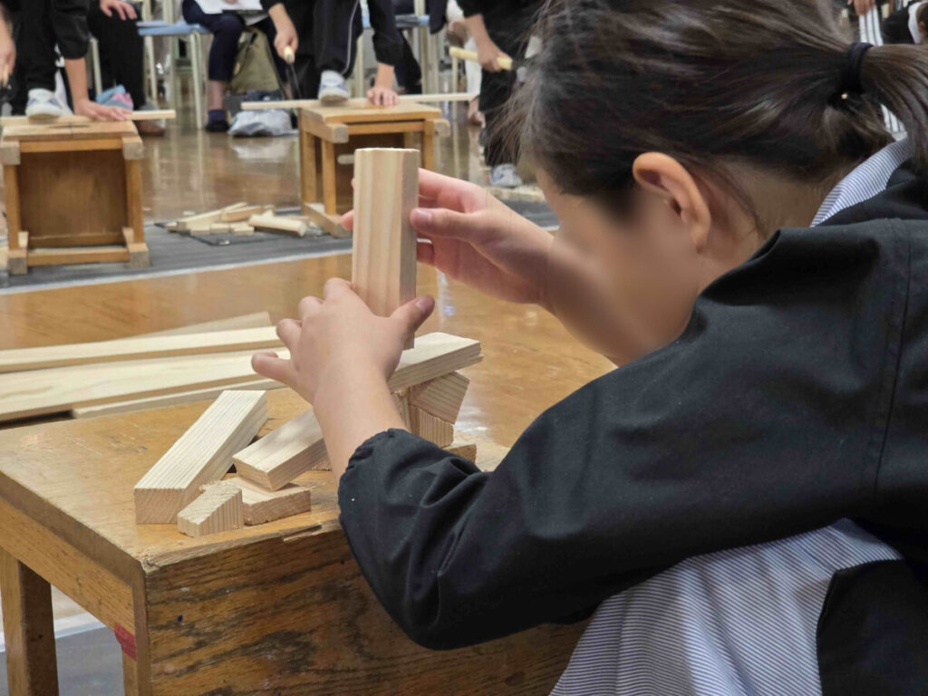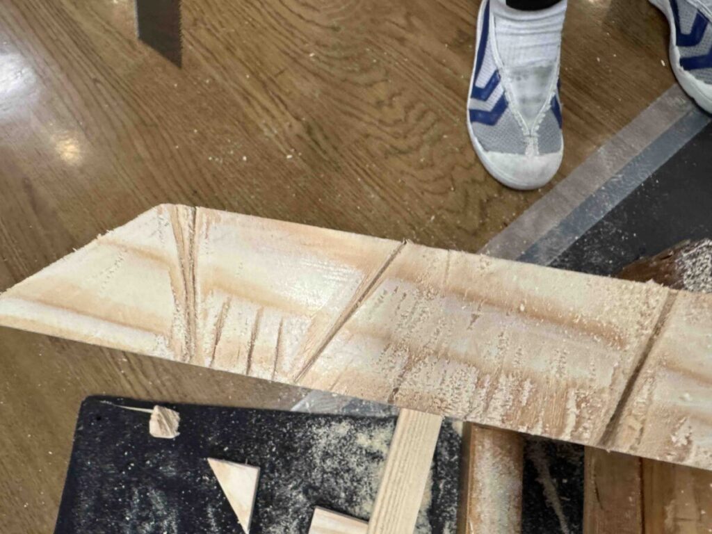 私は授業を通して、子どもの視点に寄り添った題材づくりの大切さを改めて感じました。そのことで、木を切りたい、つくりたいという子ども側の思いと、木をたくさん切りながら用具の扱い方や木の思いや表現を広げてほしいという教師側の思いが釣り合うのではないでしょうか。