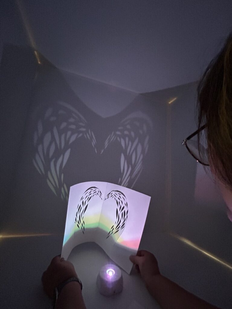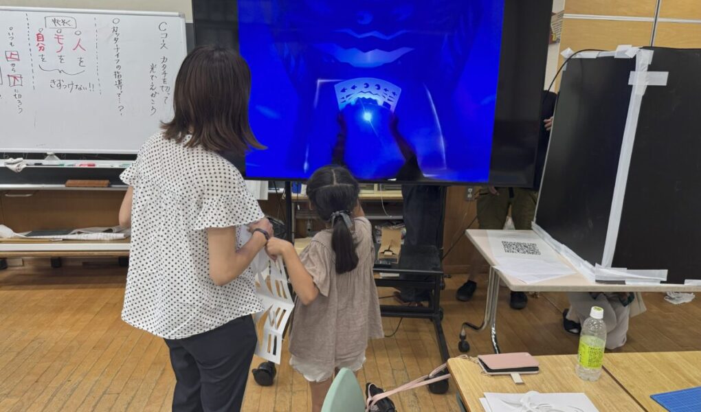 カッターの活用方法を体験。切り取った穴に光を通して鑑賞すると、切取る形や切り方、さらに暗い箱の中で紙を動かして映し方を変えて、色々な見方ができました。切った形が「鳥に見えた!」「プラネタリウムみたいに星が動くよ!」と、そして「もっと色々な形を見つけたい、カッターで切りたい!」と娘もカッターを夢中になって使っていました。上映しながら鑑賞できるのは、ワクワク感が倍増して、切り方の幅も広がりとても良い素敵な方法ですね。安全上のコツや伝え方も教えて頂きとても勉強になりました。